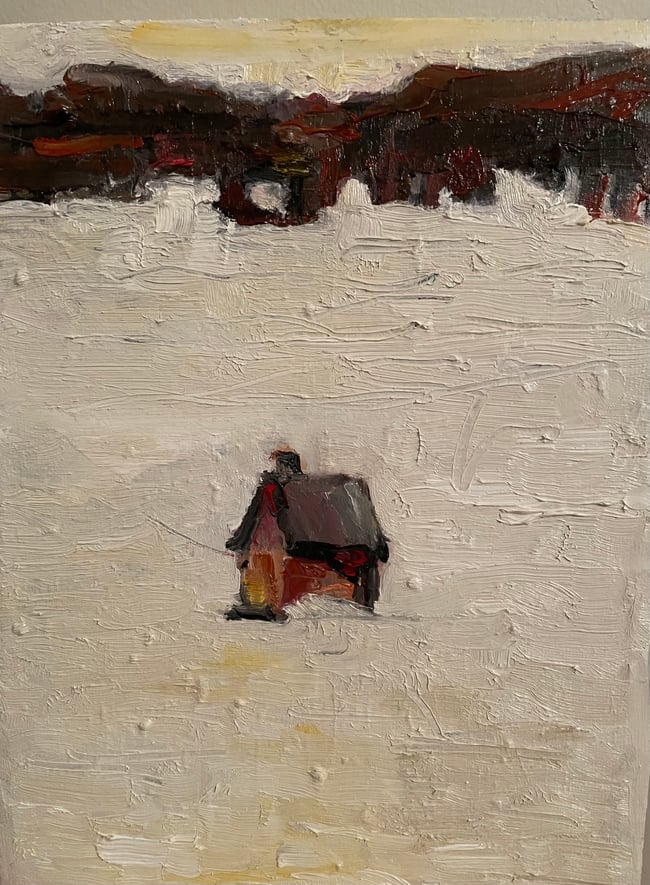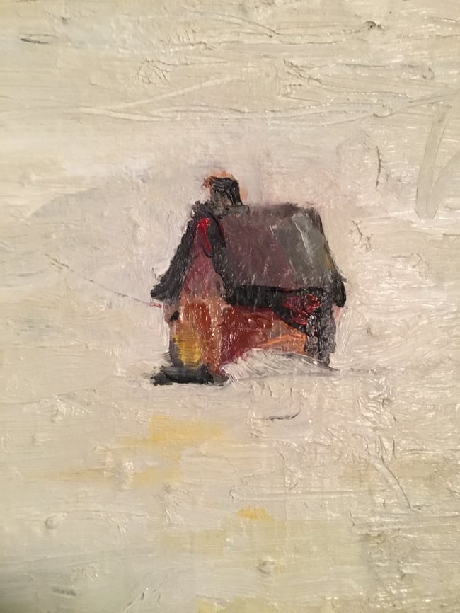 Provocative placement of an ice hut on a frozen lake. A place of quiet, to dream, to be at peace. 12 x 12 acrylic on canvas