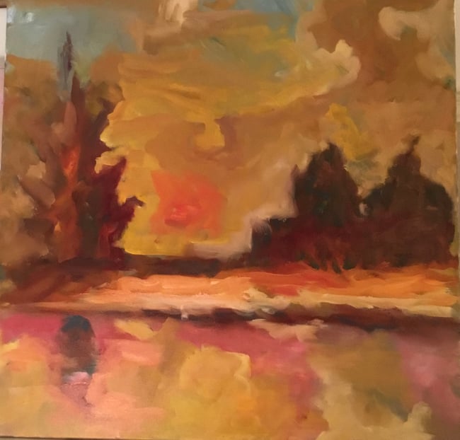 The morning light as it engulfed the trees spread a rich warm glow to the waiting lakeside. Rich browns, yellow, burgundy make this piece sing