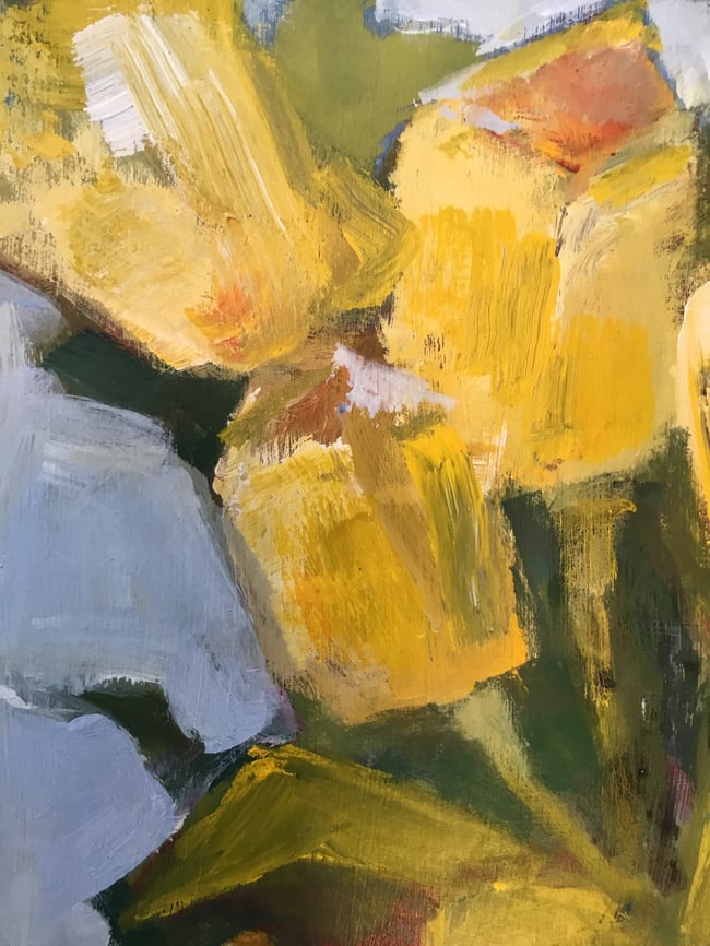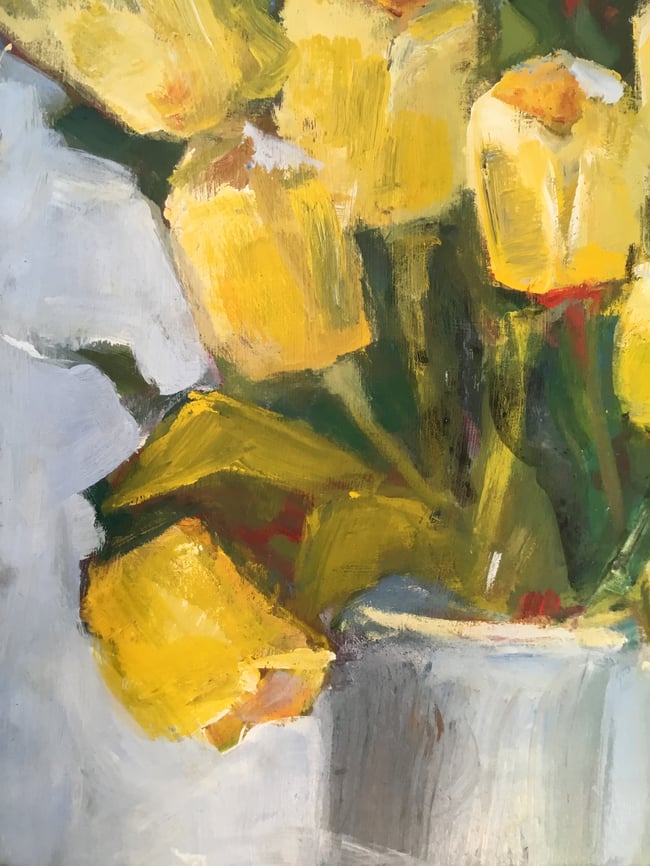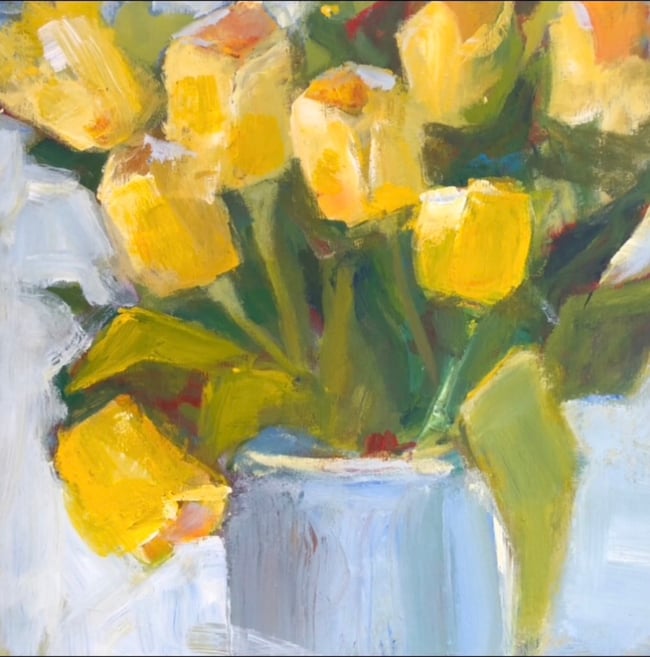 Acrylic on Canvas 36 x 36. A feast of yellow tulips overflowing a vase creating a lush and dramatic statement of generosity and opulence in any room. This would be the centre piece.